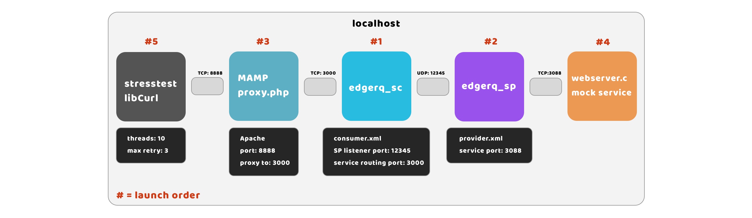 We launch edgerq_sc and edgerq_sp on the same machine where we run the MAMP suit - in this case, it's Apache MySQL & PHP running on MacOS, but feel free to use any HTTP server such as Nginx. Note that MySQL is not actually utilized in this example. The sample stresstest program performs requests in multiple threads to the Apache server's sample proxy.php script which in turn just forwards the request together with all attributes to edgerq_sc which in turn forwards this request to edgerq_sp which again forwards the request to the sample webserver we provide which answers every request with a standard answer.